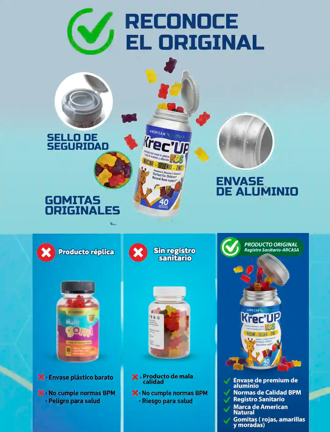 ¡Olvídate de las peleas para que tomen sus vitaminas! Haz que la nutrición sea el momento favorito del día con KREC' UP Kids. Estas deliciosas gomitas de American Natural están cargadas con las vitaminas y minerales esenciales que tus hijos necesitan para crecer fuertes, sanos y llenos de energía.