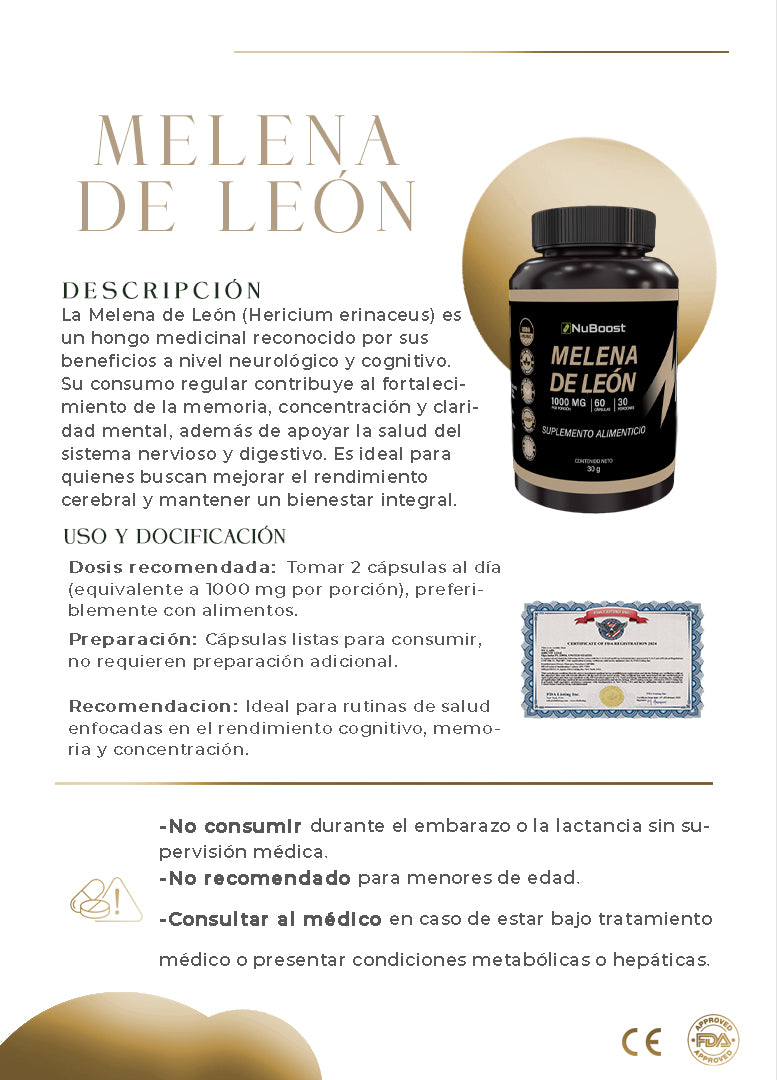 Despierta tu mente de forma natural. El hongo Melena de León (Hericium erinaceus) es famoso en el mundo de la salud por ser un potente alimento para el cerebro. Si sientes fatiga mental, falta de concentración o estrés digestivo, este suplemento vegano es el impulso que necesitas.